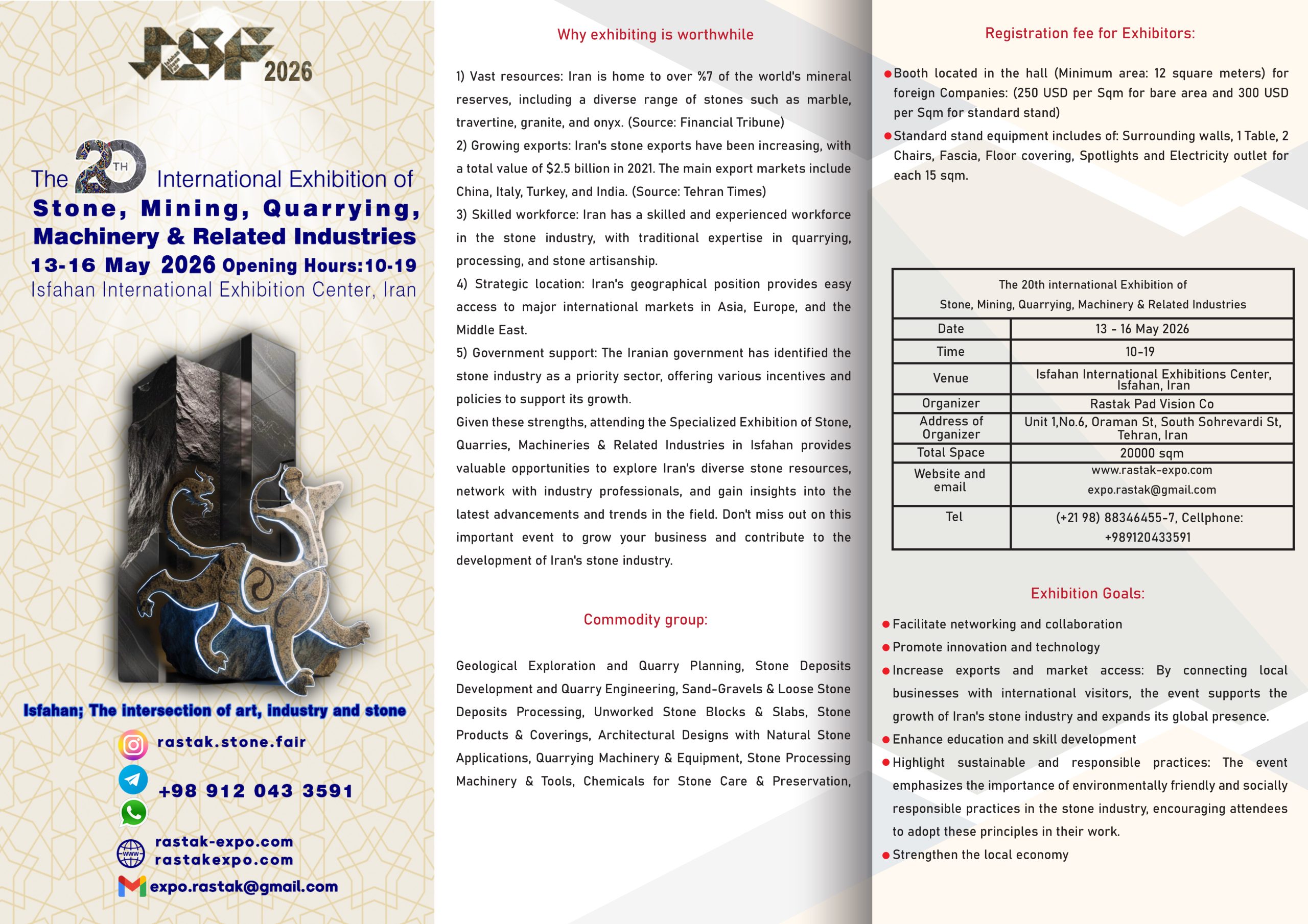 Rastak Pad Vision Co. official member of the Iran International Exhibition Organizers Association (IEOA) in cooperation with the International Exhibitions of Isfahan organizes 20 th International Exhibition of Stone, Quarries, Machineries & Related Industries, ISF 2026, which will be held on 13- 16 May 2026 in Isfahan, Iran. ISF 2026 is an outstanding event for stone, mines, processing machinery, mining equipment and tools for mining, trade and commerce. This exhibition brings experts and all people who are active in this field together. In addition, it is a great opportunity for companies to show their products and capabilities. In the last edition which was held in 2023 more than 100 companies in the area of over 16000 sqm participated. Companies from China and representatives from Italy also attended. If you are interested in participating in the ISF 2026 exhibition, please contact Rastak Pad Vision Co. for more information on how to reserve your booth and showcase your products and services to a wide range of industry professionals. This exhibition is a great opportunity to network, increase sales, and find new customers and partners in the stone industry. Don't miss out on this chance to be a part of this prestigious event in Isfahan, Iran.